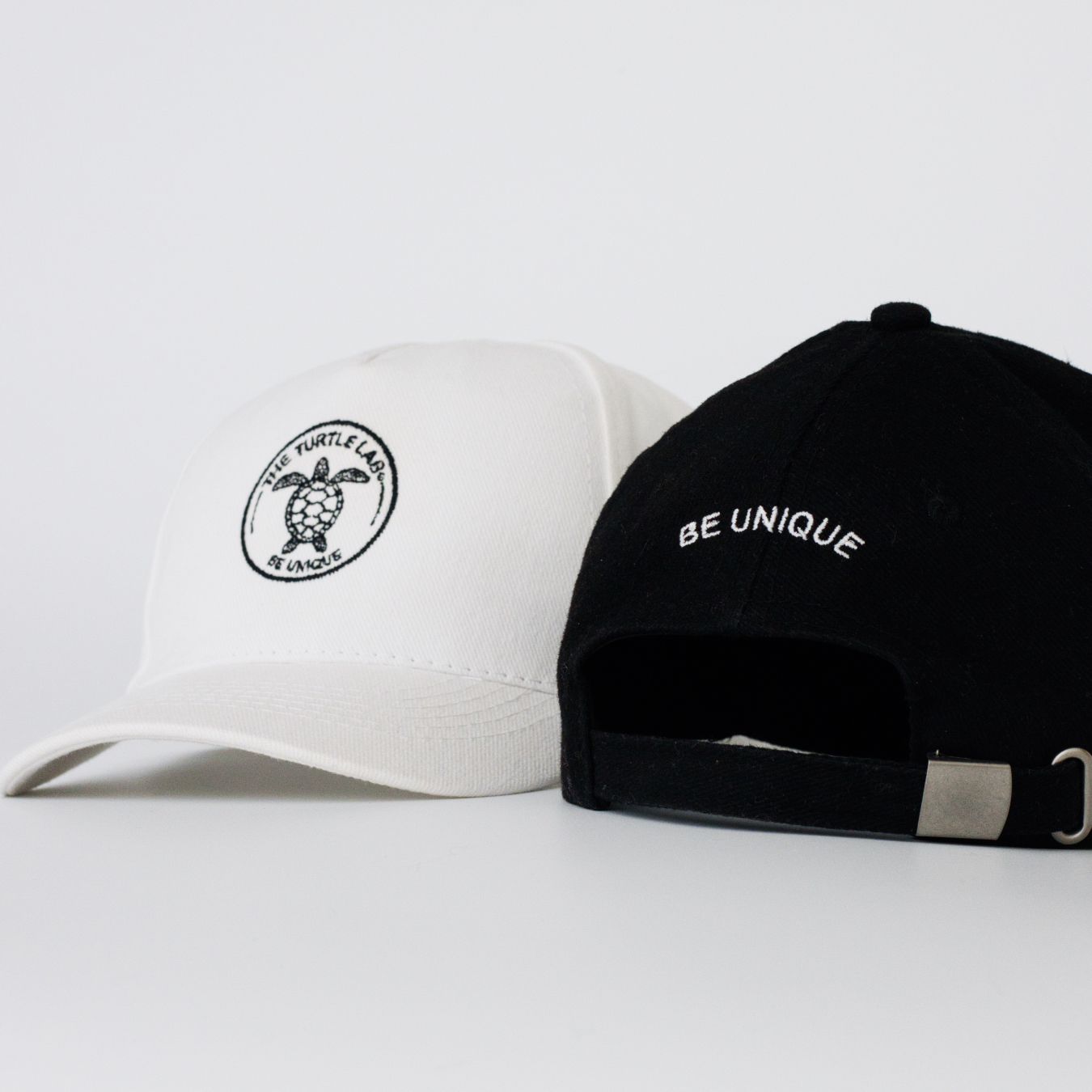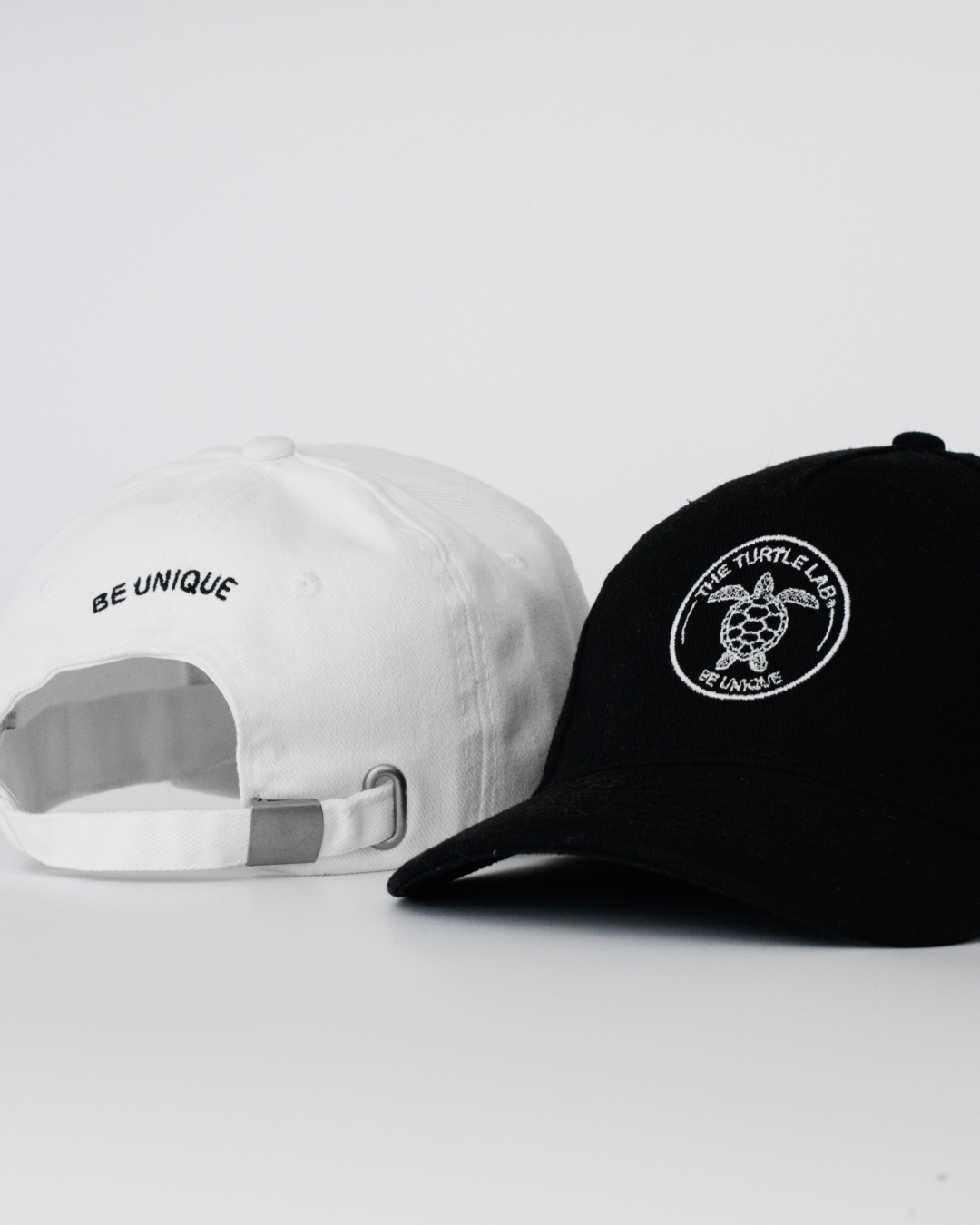 • Dois bonés, um branco com logótipo preto de tartaruga e texto, outro preto com frase branca e fivela metálica