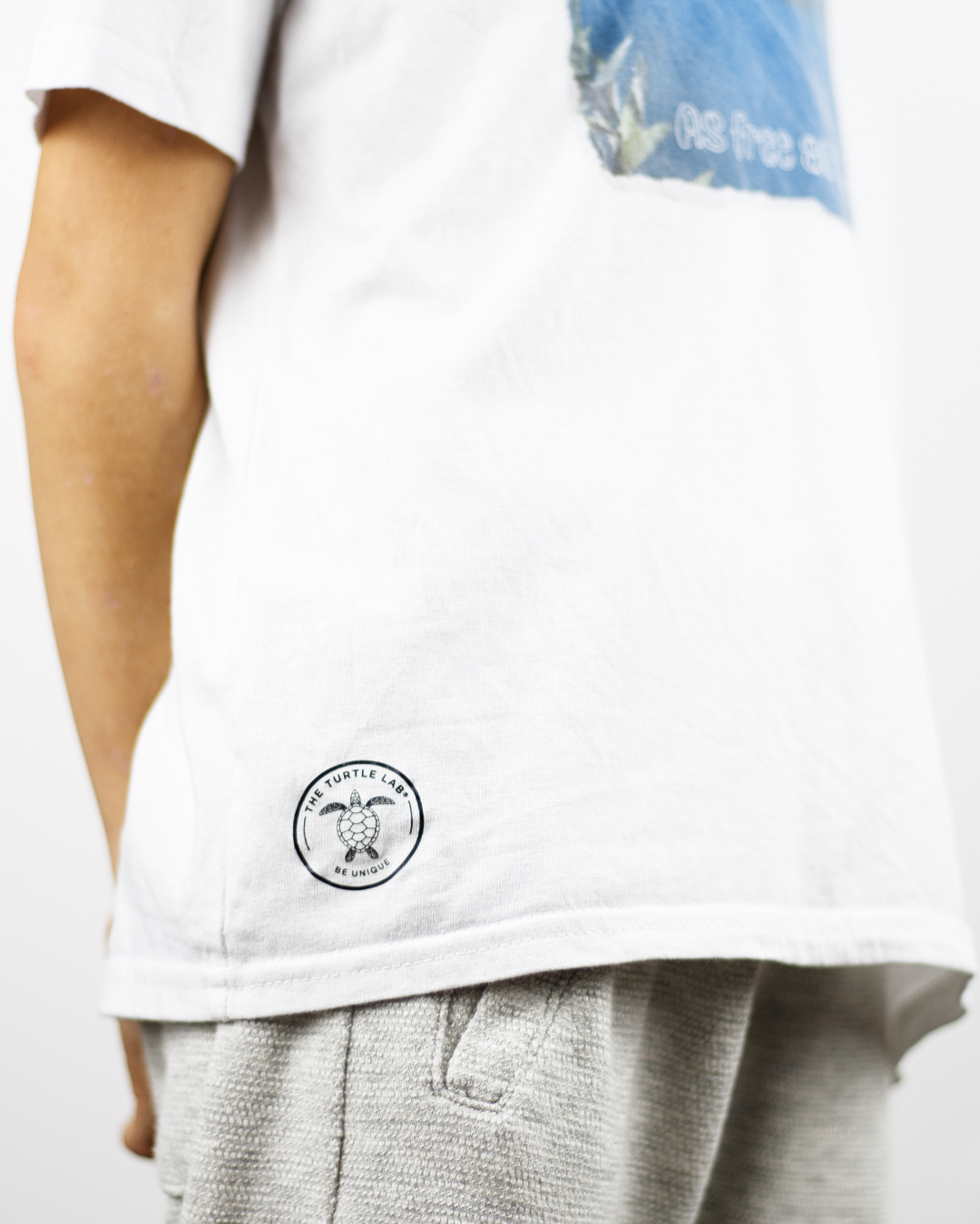 • Parte inferior de t-shirt branca com etiqueta de tartaruga e calças cinzentas