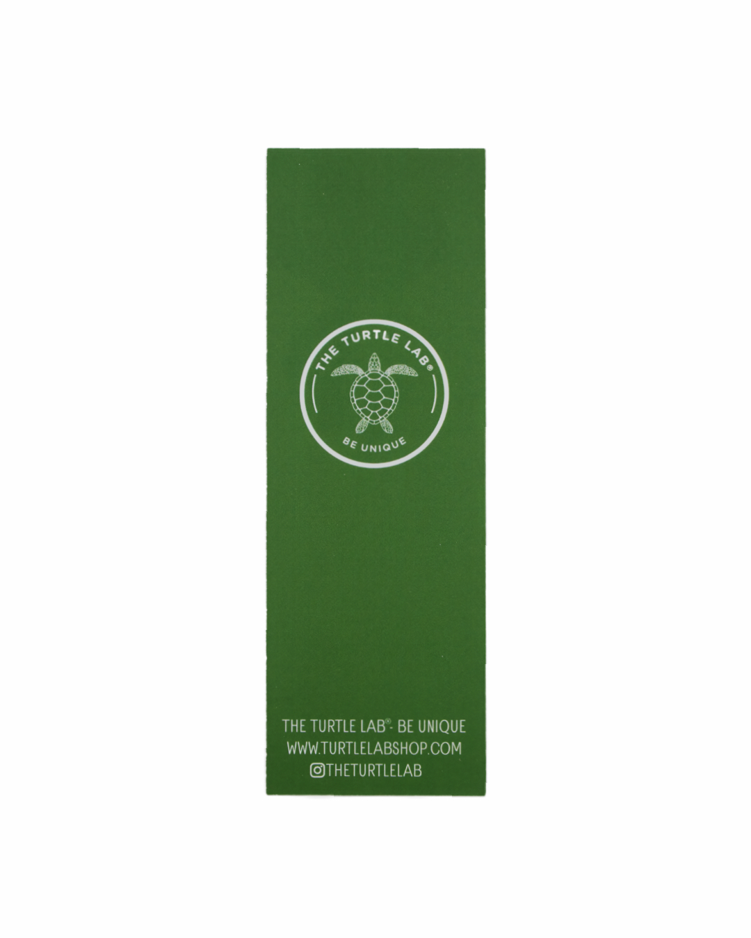 • Etiqueta verde com logotipo de tartaruga e textos brancos