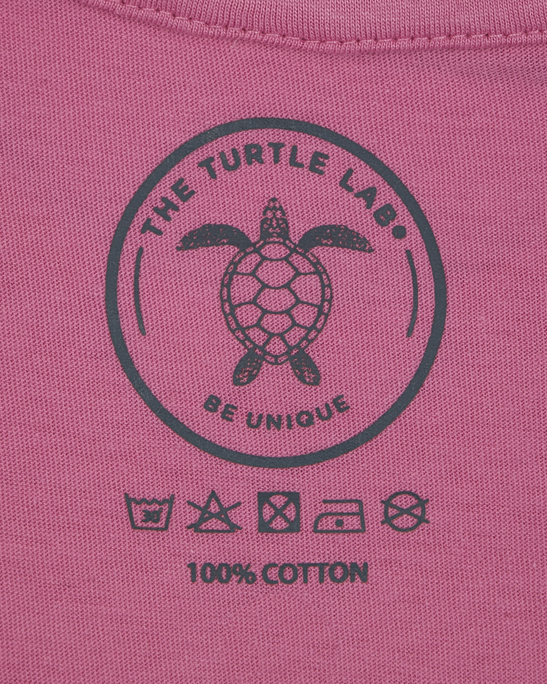 • Etiqueta interna rosa com logotipo de tartaruga e instruções de lavagem