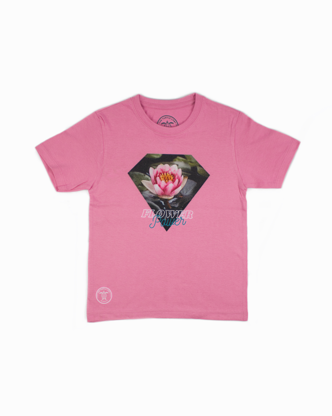 • T-shirt rosa com estampa de flor de lótus e texto FLOWER power