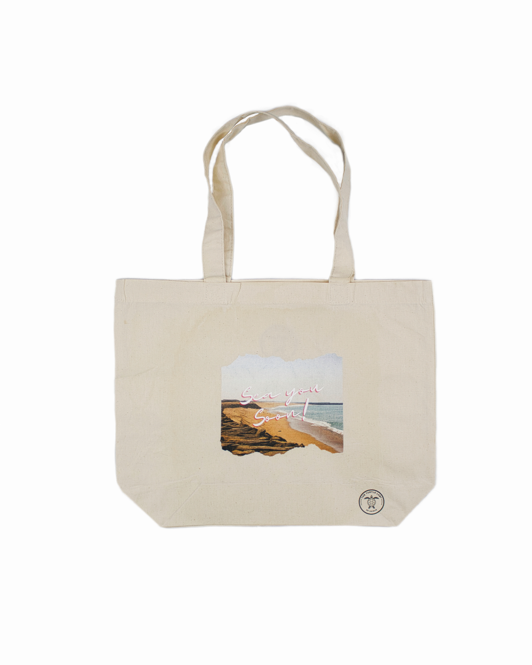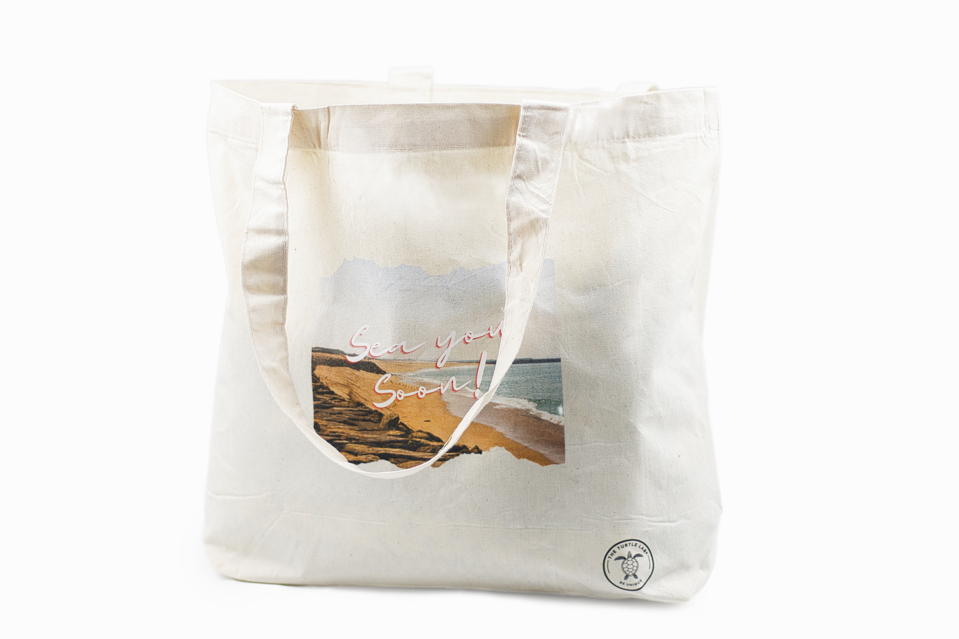 • Mala de tecido bege com imagem de praia e texto See Your Spirit