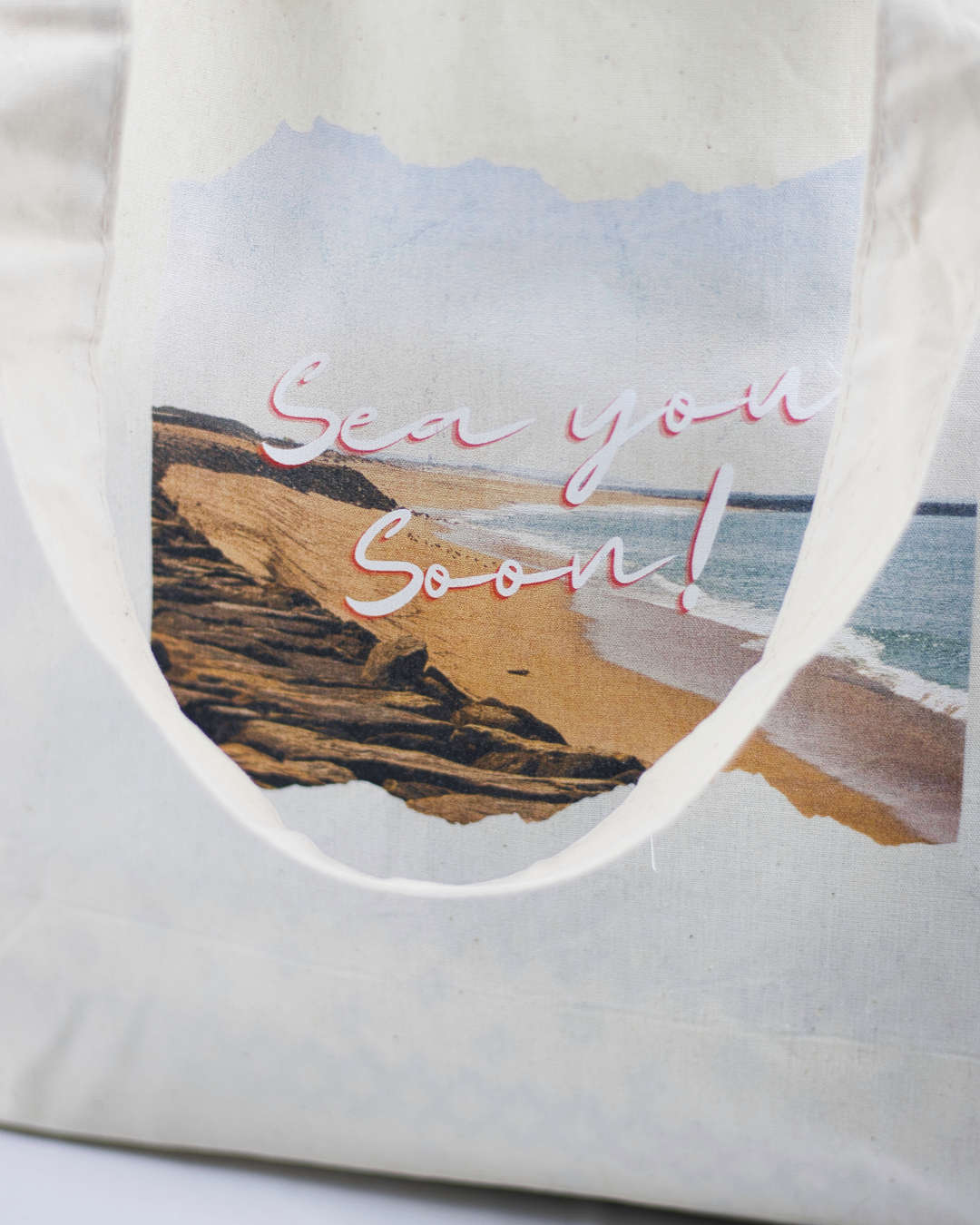 • Saco de tecido branco com estampa de praia e texto See you soon