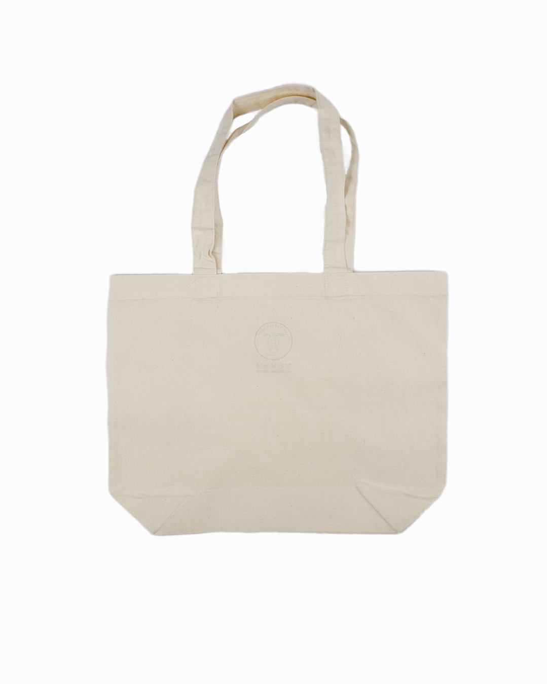 • Saco de tecido bege claro com alças compridas e logotipo circular