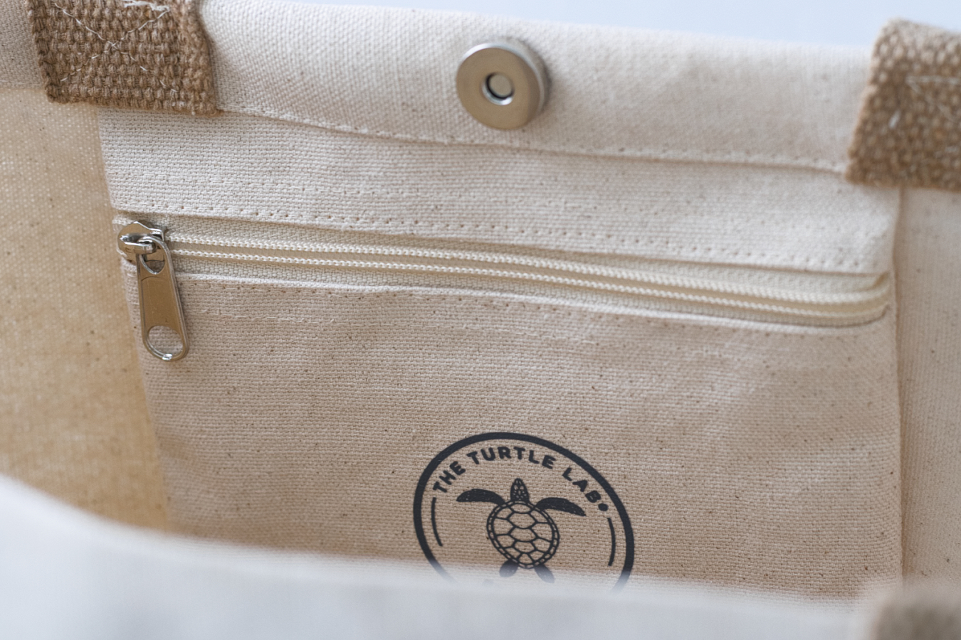 • Interior de bolsa bege com bolso e logótipo THE TURTLE LAB.